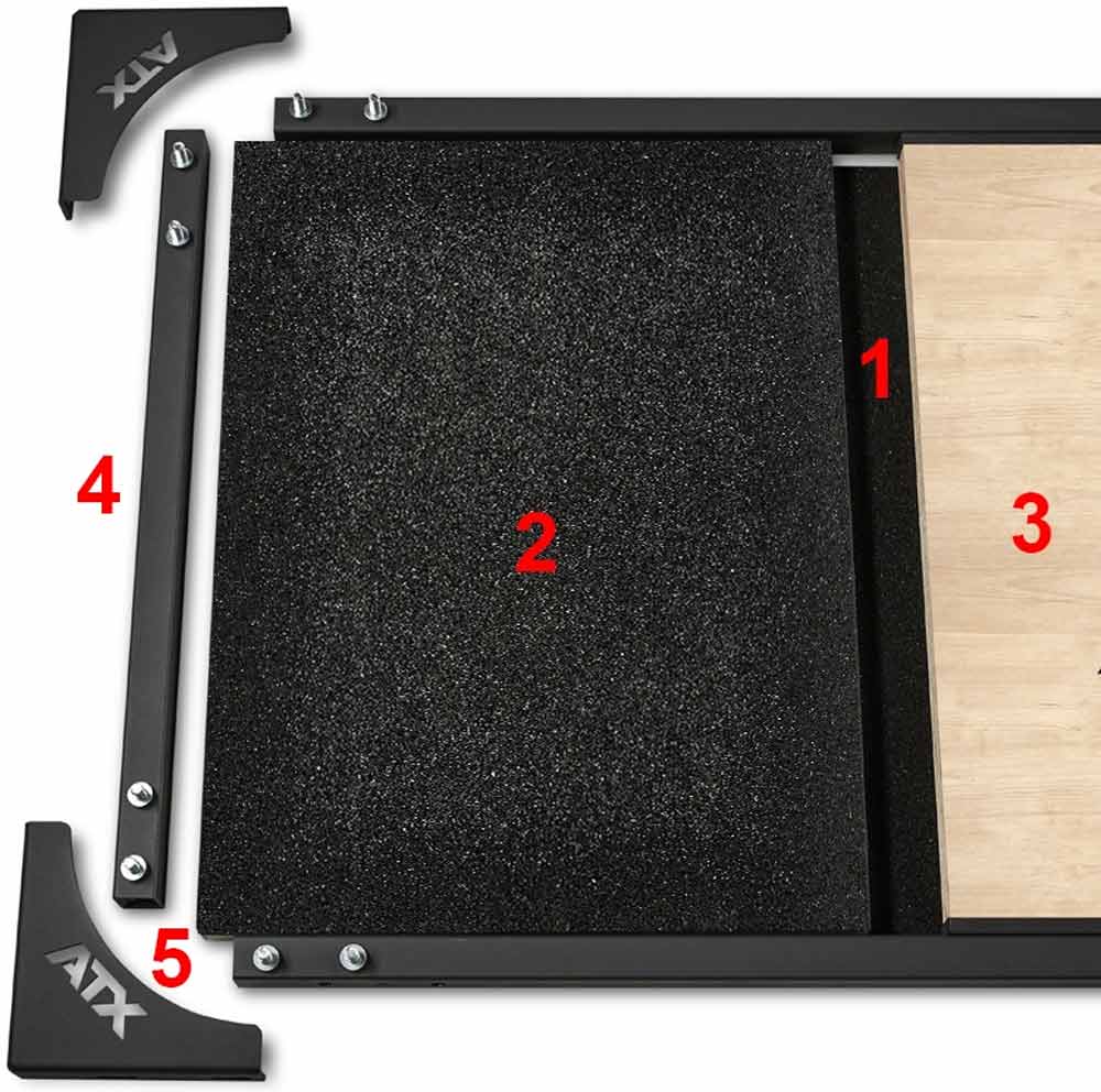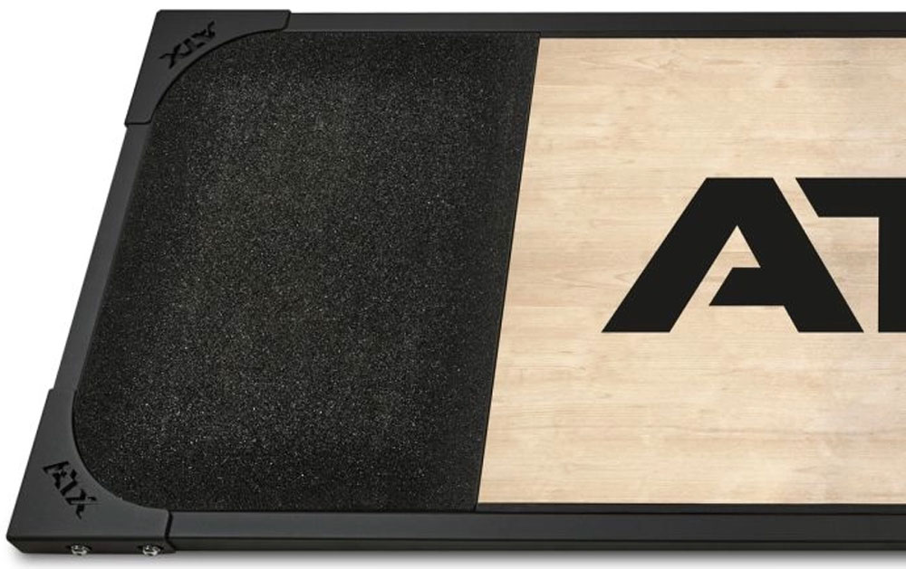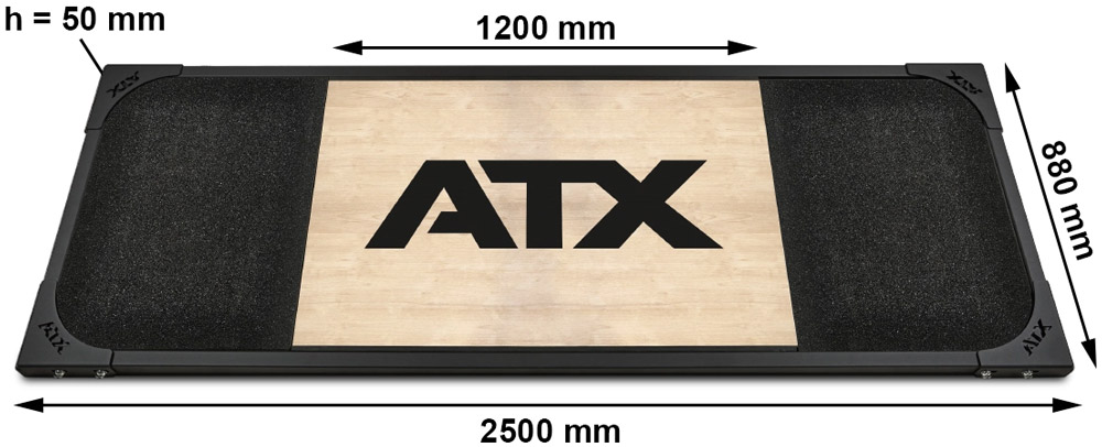 Diese extra starken Abwurfplatten, aus hochverdichteten Gummigranulat, sind stark schalldämmend und kraftabbauend, dauerelastisch und bruchsicher und schützen somit hervorragend Equipment und Untergrund. Die Standfläche besteht aus einer 40 mm starken, massiven Multiplexplatte mit Hochleistungs-Vinylfolie beschichtet und integriertem ATX®-Logo (eigenes Kundenlogo gegen Aufpreis möglich). Die Folie verfügt über eine fein strukturierte, rutschhemmende Oberfläche (R9-Rutschhemmklasse nach DIN 51130 zertifiziert). Zusätzlich ist unterseitig eine 10 mm starke Dämpfungsmatte eingebaut, welche die Dämpfungseigenschaften der Plattform optimiert. Durch das hohe Eigengewicht und den robusten Stahlrahmen, der die Holzplatte und die Gummigranulatplatten umschließt, ist die Plattform äußerst rutschfest.