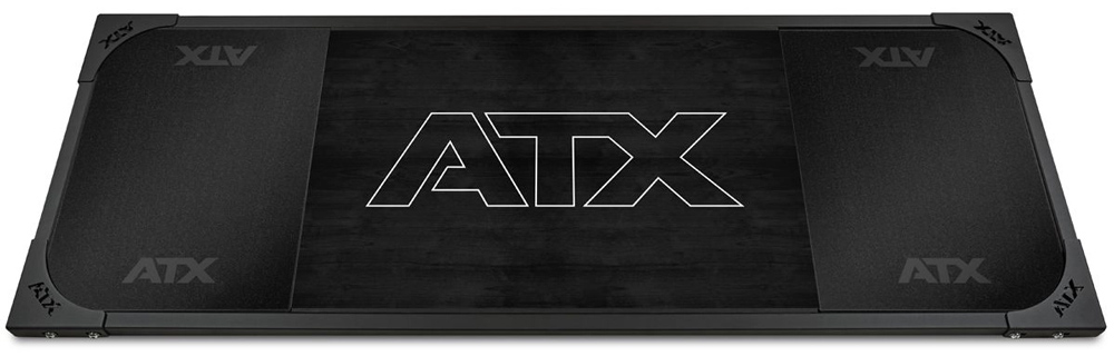 Die beiden 40 mm starken Vollgummi-Abwurfplatten sind unterseitig mit einem Hohlkammer-Wabensystem (Shock-Absorption-System) versehen, das einen hohen Kraftabbau und eine optimale Dämpfung gewährleistet. Die Standfläche besteht aus einer 40 mm starken, massiven Multiplexplatte mit Hochleistungs-Vinylfolie beschichtet und integriertem ATX®-Logo (eigenes Kundenlogo gegen Aufpreis möglich). Die Folie verfügt über eine fein strukturierte, rutschhemmende Oberfläche (R9-Rutschhemmklasse nach DIN 51130 zertifiziert). Zusätzlich ist unterseitig eine 10 mm starke Dämpfungsmatte eingebaut, welche die Dämpfungseigenschaften der Plattform optimiert. Durch das hohe Eigengewicht und den robusten Stahlrahmen, der die Holzplatte und die Vollgummiplatten umschließt, ist die Plattform äußerst rutschfest.