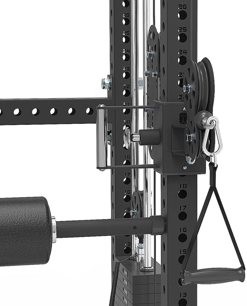 Das ATX® Multi-Pull Rack MPHR-740 - 2.0 ist deutlich mehr als nur ein Half Rack mit integrierter Zugstation - es ist eine Kraftstation welche keine Wünsche offen lässt und den höchsten Ansprüchen gerecht wird. 6 Zugpunkte mit Rollen-Schwenkarme ermöglichen multifunktionelle Zugvarianten. Alle 6 Zugpunkte sind mit den 2 x 110 kg Steckgewichten in der Übersetzung 2:1 verbunden. Die jeweils 2 mittig platzierten Zugrollen können alternierend und durch den im Lieferumfang enthaltenen Zugverbinder synchron genutzt werden. Dies ermöglicht eine Vielzahl von einarmigen,-alternierenden oder synchronen Zugvarianten. Durch die Kopplung können schwere Zugübungen wie das Latziehen oder das sitzende Rudern professionell ausgeführt werden. Die im LIeferumfang enthaltene Beinstütze und die teleskopierbare Fußstütze ermöglichen dabei eine sichere Fixierung. Die an den vorderen Upright-Tubes angebrachten Rollen-Schwenkarme sind in der Höhe wie auch in der Breite verstellbar und ermöglichen enge und extra breite Zugvarianten (Cable-Cross-Over)