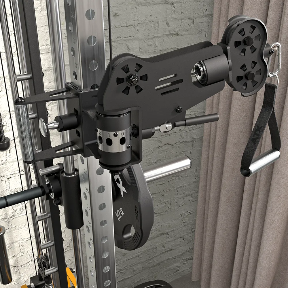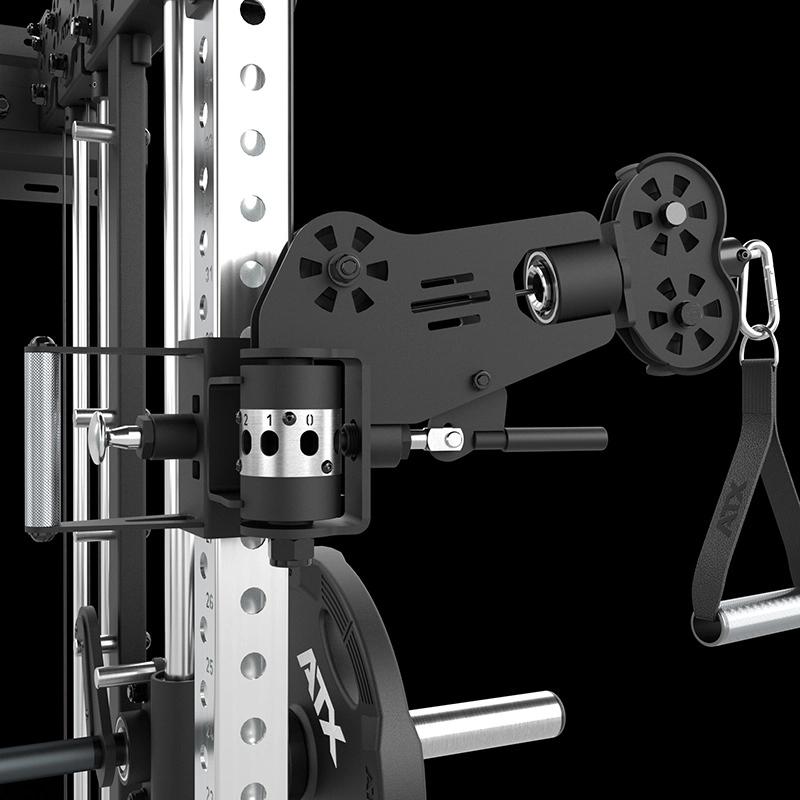 Diese erstklassige verarbeitete Kraftstation ermöglicht die Ausführung nahezu aller wichtigen Grundübungen im Kraftsport – von Klimmzügen, Kniebeugen, Bankdrücken und Nackendrücken - und das frei am Hantel-Rack oder an der linear geführten Multipresse! Die doppelseitigen Seilzüge ermöglichen alle relevanten Zugübungen von Oben und Unten und sind mit erstklassigen ATX® - XT-Armen (schwenkbare Auslegearme) ausgestattet, welche enge und breite Zugübungen (z.B. Cable-Cross) ermöglichen.