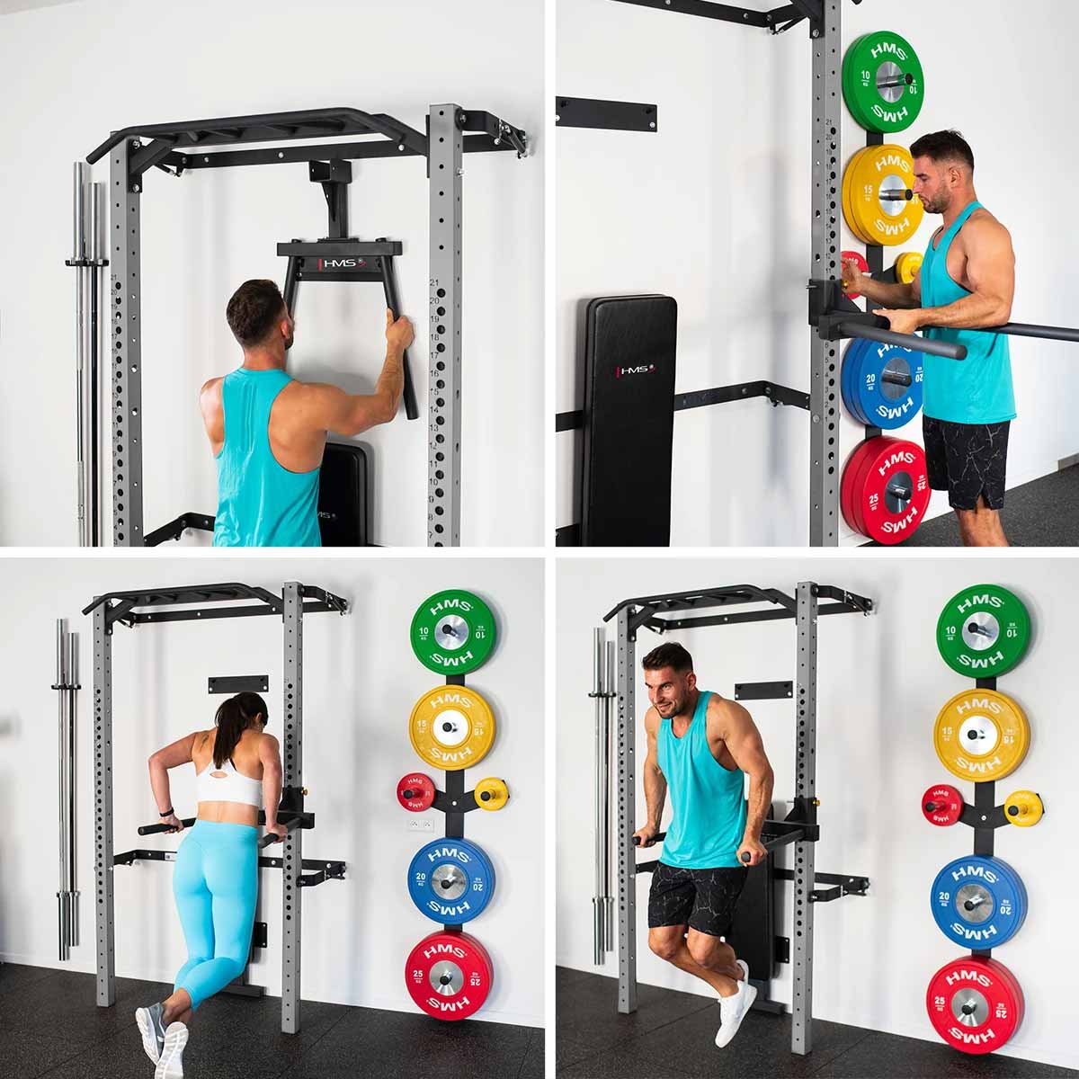 Die integrierte Klimmzugstange bietet mehrere Griffvarianten und ermöglicht ein effektives Training von Rücken-, Schulter- und Brustmuskulatur. Klimmzüge gehören zu den effektivsten Übungen für den Oberkörper, da sie mehrere Muskelgruppen gleichzeitig aktivieren. Ergänzt wird das System durch höhenverstellbare Langhantelhaken, die flexibel positioniert werden können und sich optimal an unterschiedliche Übungen anpassen lassen.