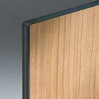 Die umlaufende anthrazitfarbene Kante zeigt das hochverdichtete Vollkernmaterial der HPL-Platte.