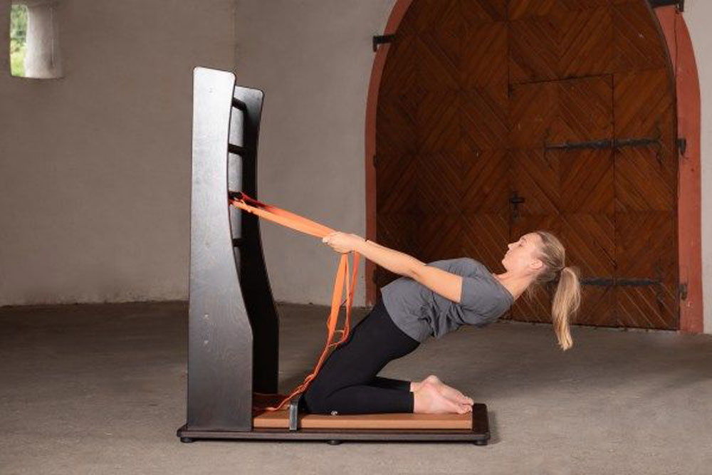 Der Trainierende hält die Knie hüftbreit, die Füße liegen flach auf. Das Becken wird diagonal nach vorne oben geschoben. Das Band wird in aufrechter Position Richtung Brustkorb herangezogen, mit Neigung des Oberkörpers nach hinten werden die Arme langsam nach vorne ausgestreckt. Dabei sollte der Kopf in Verlängerung der Wirbelsäule bleiben, mit Kinn leicht eingezogen. Beckenaufrichtung muss permanent ge- währleistet sein. Ist die individuelle Beweglichkeitsgrenze unter Muskelspannung erreicht, wird das Band langsam nach vorne gestreckt um den Reiz zu vergrößern. Die Spannung ist während der Übung im Quadrizeps und der Bauchmuskulatur zu halten. Ziel ist es, eine möglichst hohe Muskelspannung zu erzeugen und diese unter kontrollierter tiefer Atmung zu halten.
