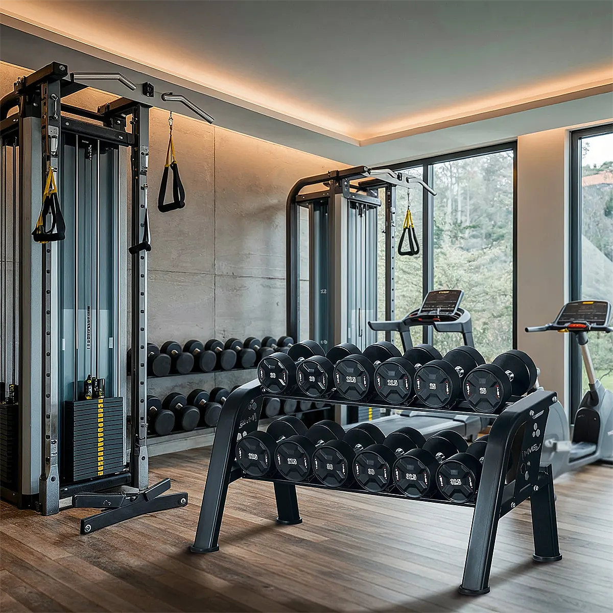 Zwei Ebenen – maximale Ordnung & leichter ZugriffDer STR48 verfügt über zwei großzügige Ablagen, die bis zu 12 Kurzhanteln sicher aufnehmen können.