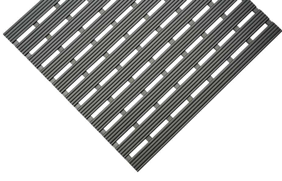 Das Unterprofil hat in regelmäßigen Abständen “Aussparungen”. Damit ist gewährleistet, dass zwischen den Profilen kein Wasser stehen bleibt und schnell verkeimt.Die langlebigen, aus hochwertig schlagzähem Hart-PVC bestehenden Oberprofile, liegen quer zur Laufrichtung. Die Matte verfügt über einen allseitigen Wasserablauf und liegt aufgrund ihres hohen Eigengewichtes von ca. 6 kg/m² gut auf dem Boden (kein Aufschwimmem).
